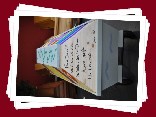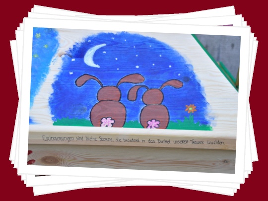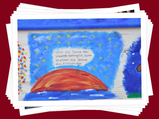 Studien zeigen, dass Gefühle in Farbe ausgedrückt, wahre Wunder wirken und unendlich heilsam für den Betroffenen sind. Hierbei ist es völlig egal, ob Sie malen können oder nicht, denn die Erfahrung zeigt, dass sobald man sich mit dem Thema beschäftigt, wahre Kunstwerke entstehen, auch ohne Können. Schön ist es immer wieder zu beobachten, wie Familien gemeinsam "Ihr Projekt" angehen. Erst zaghaft und nicht wissend was eigentlich zu tun ist um dann im Tun festzustellen, dass man das Wissen um den Verstorbenen wunderbar in verschiedene Muster, Motive und Bilder ausdrücken kann.